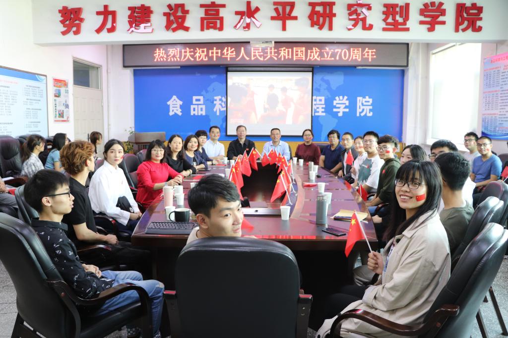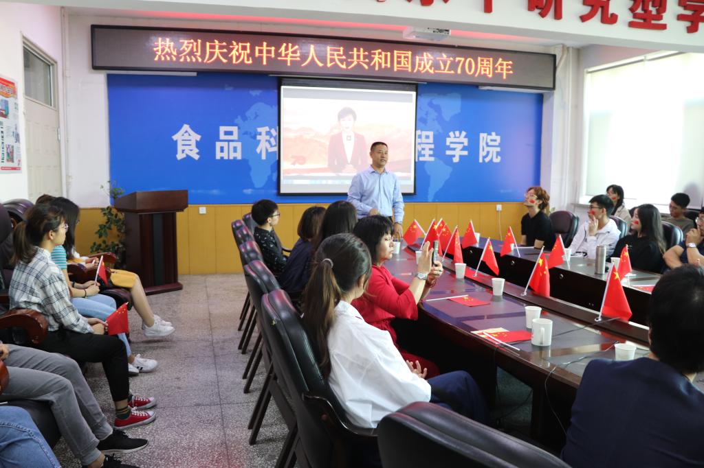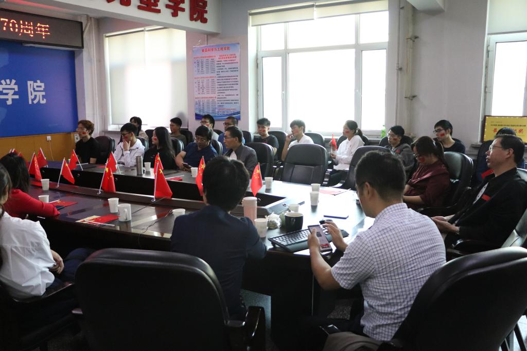 组织学院师生在食品楼三楼会议室集体观看庆祝中华人民共和国成立70周年大会、阅兵式直播。学院领导班子成员、党委委员、党支部书记、全体管理干部、教师和学生代表参加了此次会议。