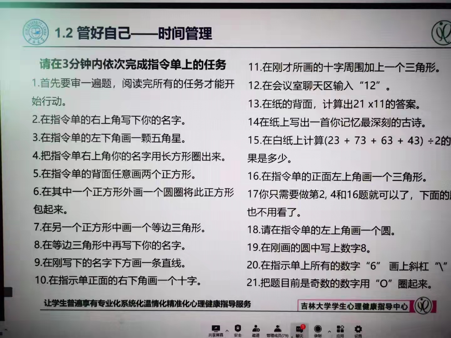 汤晓老师从三个方面展开讲解:我们的生活会是什么样?我们可能会面临什么问题?那我们要怎么办?汤老师向我们介绍了研究生的生活和本科阶段生活的不同,而且可能会面临一系列的问题,如学习压力、专业兴趣、就业压力、经济困难、人际交往、恋爱婚姻和现实目标等。那么面对这些问题,汤老师首先提出我们应该管好自己,其中包括目标管理、时间管理和压力管理。一个好的目标管理是具体、可测量、可实现、有现实意义和有明确期限的;同时在时间管理上,汤老师建议我们提前列出“碎片时间清单”,增加碎片化价值;而做好压力管理应解决拖延问题,即对拖延“温柔”一点。其次汤老师提出我们应该用好资源,包括知识资源、人际资源和专业资源。汤老师向我们普及了在研究生阶段会对学生心理产生影响的一些常见的危机源及处于心理危机时的情况,同时学生应有良好的人际交往关系,待人真诚,学会共情,学校也有很多专业资源供学生充分利用,各个校区都设有学生心理素质培养基地为学生提供心理辅导与咨询。最后,汤老师向同学们介绍了学校心理咨询的地址和预约方式,欢迎同学们预约咨询,正如汤老师在结束时送给同学们的一句话:请记得,在你成长的道路上,如果需要我们助你一臂之力,学生心理健康指导中心一直守护在你的身边!
