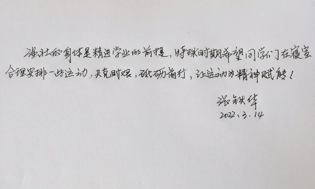 最后,“体育之效,至于强筋骨,因而增知识,因而调感情,因而强意志。”正如学院院长张铁华教授对同学们说的:“强壮的身体是精进学业的前提,特殊时期希望同学们在寝室安排合理运动,共克时艰,砥砺前行,让运动为精神赋能!”运动时,大家可以全身心投入其中,激活大脑神经,提升身体机能,进而增加“续航时间”,提升学习的专注力和效率。运动健身不仅增强人的体格、提升身体机能,也能磨练人的意志、锤炼人的精神,增强战胜疫情的信心。