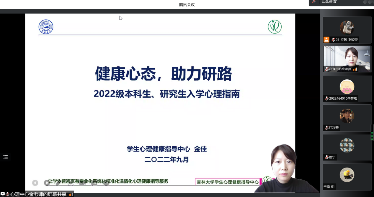特邀心理健康指导中心金佳老师,为2022级研究生新生作一场以“健康心态,助力研路”为主题的线上讲座,讲座由bl动漫