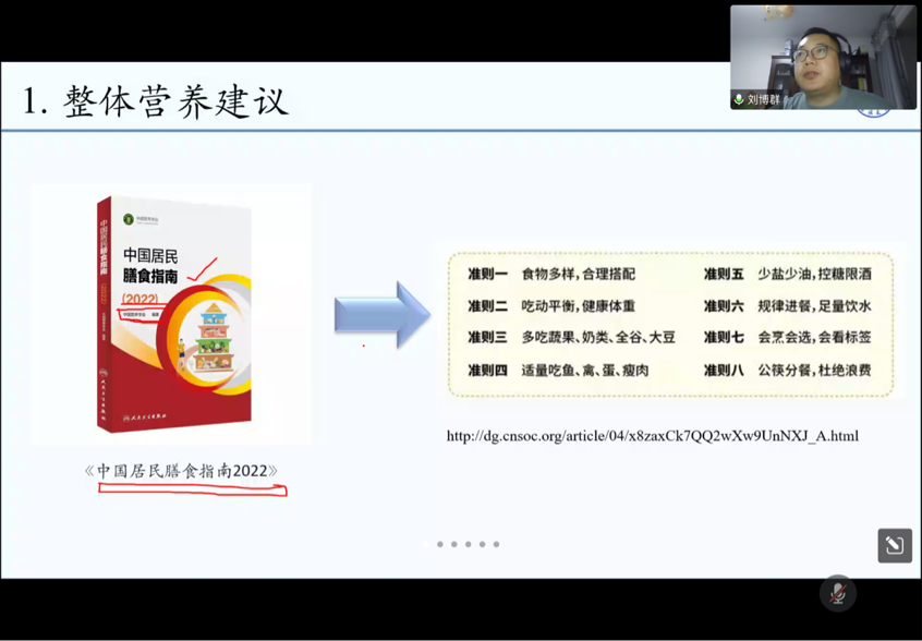 随后,主讲嘉宾刘博群副教授围绕“儿童营养组合助力健康成长”和“青年有颜有养食尚健康指南”两方面内容进行了科普讲座。刘博群副教授立足于整体膳食营养、儿童科学喂养以及青年食尚健康的膳食问题,分别给出了科学、可行的营养建议。提倡广大师生友人要注重4方面健康理念: 一是吃动平衡,健康体重,坚持运动;二是少盐少油,控糖限酒;三是“规律进餐,足量饮水”;四是“会烹会选,会看标签”。并就食品添加剂的定义、使用标准和应用价值进行了详细介绍,使大家了解了食品添加剂的真相,消除了对食品添加剂的疑虑。