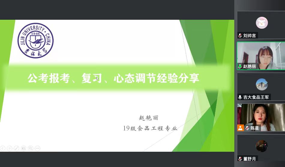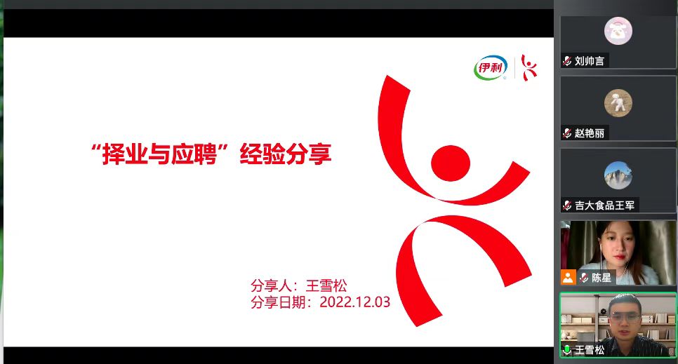 于12月3日通过腾讯会议开展了研究生就业分享交流会。我院2022届毕业生董舒月同学(河北省定向选调生)、2022届毕业生赵艳丽同学(吉林省定向选调生)、2021届毕业生王雪松同学(伊利奶粉事业部选培生)分别就选调生方面和企业方面的经验进行了精彩分享。会议由学院就业兼职辅导员陈星同学主持,学院行政副院长陈玉江、科研与研究生办公室主任王军、全体2023届毕业研究生和对分享会感兴趣的同学们聆听了本次分享会。