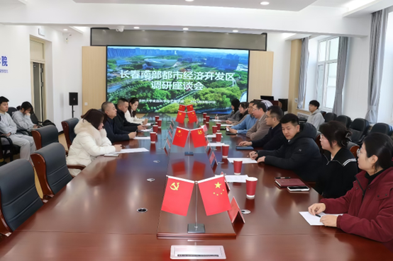 2月20日上午,长春南部都市经济开发区应急管理局、建设局、商务局、社会事务发展局联合调研组走访我院,领队张仁权局长一行4人上门洽谈交流“政产学研”合作事宜。学院院长张铁华、书记梅士伟、副书记李超、科研副院长叶海青、本科教学副院长郭娜,教师代表王虹苏、沈雪、房天琪参加了座谈会。会议由叶海青主持。