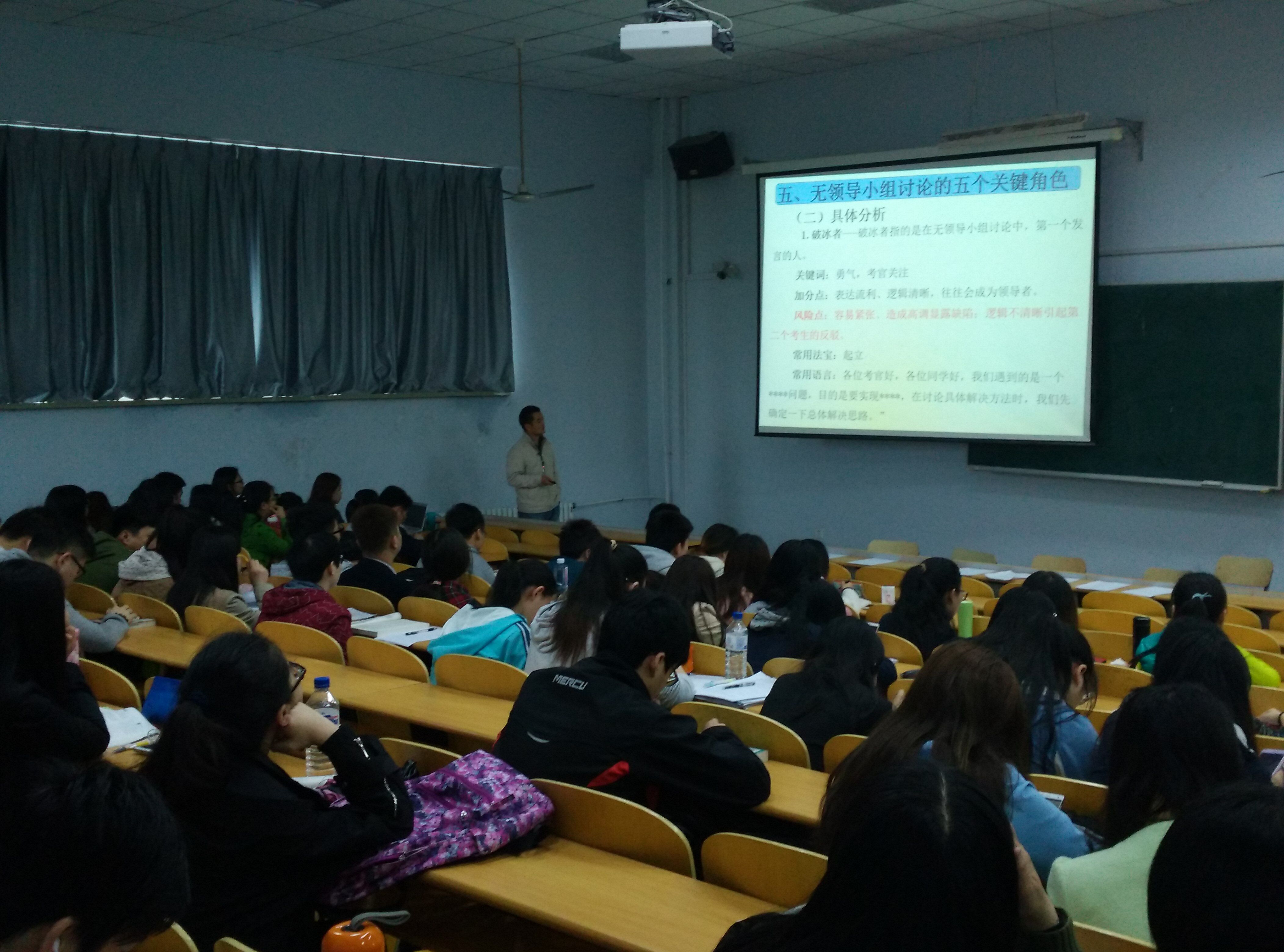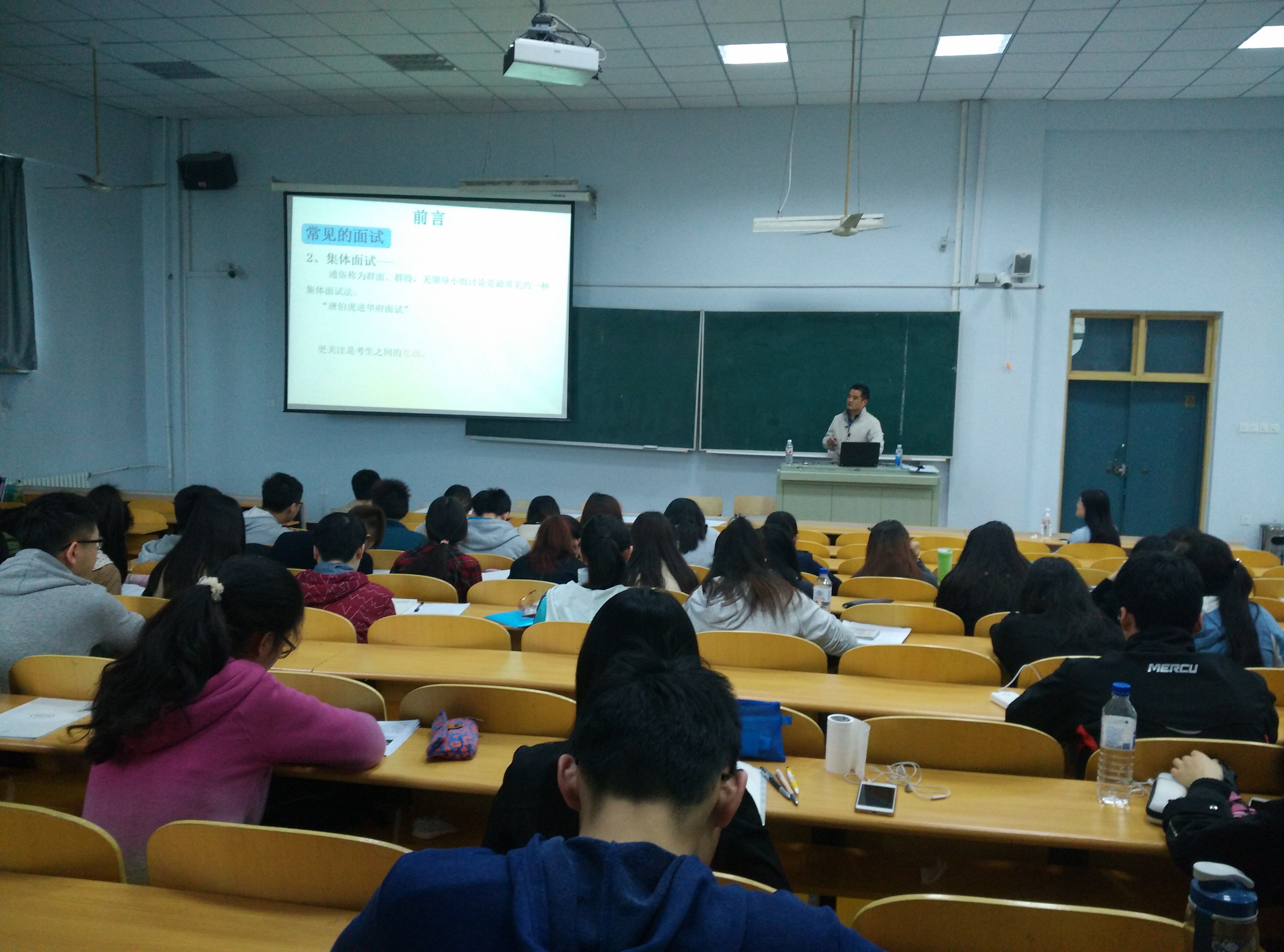 于2016年5月15日举办大学生就业指导系列讲座。本次讲座由学院党委副书记梅士伟为同学们讲解无领导小组讨论的基本要点和实战技巧。 本次讲座分为三个模块展开。首先,梅士伟老师为大家讲解了无领导小组讨论的概念、要点、角色定位、主要题型等基本知识,使大家对无领导小组讨论这一公务员考试和企事业面试的重要方式有了基本的了解。 在随后开展的现场模拟环节中,梅士伟老师为大家出了一个无领导小组讨论的经典题目,现场随机挑选七位同学进行无领导小组讨论模拟练习,并由同学担任评委。讨论过后,参加模拟的考生进行了点评。这场模拟使大家对无领导小组讨论有了更深的认识与理解。 讲座最后,梅士伟老师结合自己担任公务员面试评委的经历,为大家进一步解读了无领导小组讨论的实战技巧。此次讲座的举办,开阔了大家的眼界,使大家进一步了解了公务员和企事业单位招聘面试的流程和趋势,为今后求职面试打下了基础。