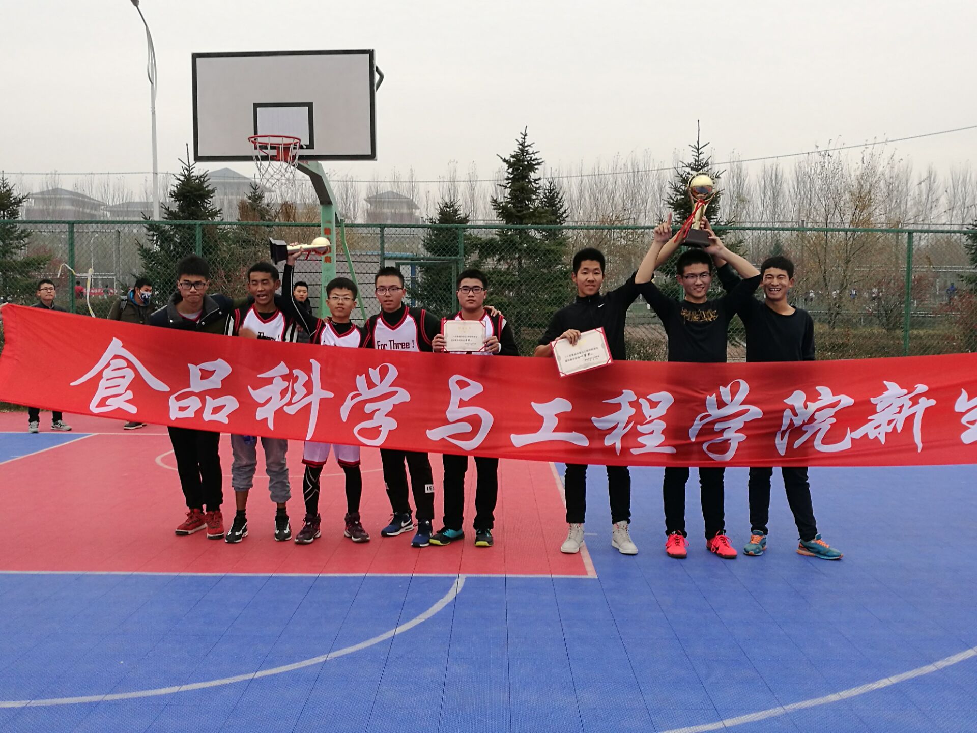 前卫校区篮球场举办了为期三天的2016级新生篮球赛。经过紧张激烈的角逐,五班的篮球小将们发挥出色,夺得冠军。 本次篮球赛采取三人赛制,同学们热情高涨,积极参与,努力训练。比赛期间,同学们团结一致、奋力拼搏,为班级荣誉而战;裁判也都恪尽职守,公正裁决。决赛当天,虽寒风瑟瑟,各班同学仍热情不减,纷纷到场,为本班参赛队员拍照记录、呐喊助威。参赛队员更是拿出看家本领,使出浑身解数,传球、抢篮板、三分远投,精彩纷呈,掌声连连。中场休息时,双方队员仍毫不懈怠,争分夺秒,商讨比赛对策,精细筹划,为下半场比赛做足准备。尽管后半场比赛异常艰苦,每个人都咬牙坚持、相互鼓励,不抛弃、不放弃,展现出了当代大学生应有的青春风采,为此次篮球赛画上了圆满的句号。 通过此次比赛,参赛队员们不仅收获了比赛友谊,提升了篮球技能,增强了班级的集体荣誉感,更充分展现了2016级新生团结向上,勇于拼搏的精神风貌。希望在今后的大学生活中,2016级的全体新生们都能向参赛的队员们学习,发扬阳光体育精神,积极参与体育活动,使自己的大学生活更加健康、出彩!