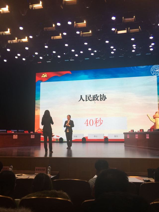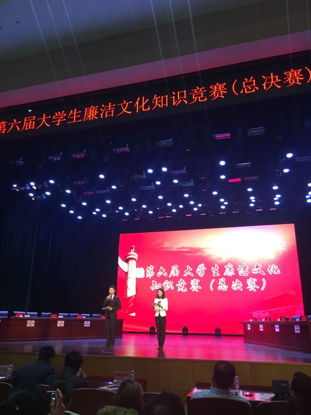 决赛共分为五个环节。第一环节为知识抢答,题目涉及国家政策、党史党规、时事政治等多方面。此环节由我院李继红和严春香同学参赛,两位同学思路敏捷,反应迅速,抢答及时,成绩优异,为后续环节奠定了基础。第二环节为即兴问答,赵杰同学就“为进一步增强廉洁文化教育的辐射力、渗透力、影响力,努力营造‘讲修养、讲道德、讲诚信、讲廉耻’的良好风尚,作为学生党员应该怎样做?”这一问题进行了3分钟的即兴论述。赵杰同学结合自身学习十九大会议精神,从学生党员的学习生活出发,充分论述了以上问题,获得在场评委的一致好评。第三环节为主题辩论,8支决赛队伍围绕“道德舆论和法律约束,何者对诚信廉洁更有效”这一辩题展开了激烈辩论。我院孟天宇同学抽到反方三辩,进行攻辩,孟天宇同学思维敏捷,论点明确,论据充分,为本队的立论争得主动权。第四环节为主题猜词,焦旭和张鑫梦同学参赛,他们配合默契,在规定时间内顺利猜完给定的10道题目,成为本环节答题最多,速度最快的一支队伍。第五环节为才艺展示,我院代表队表演的“廉政三句半”节目收到良好反响,为比赛划上圆满句号。
