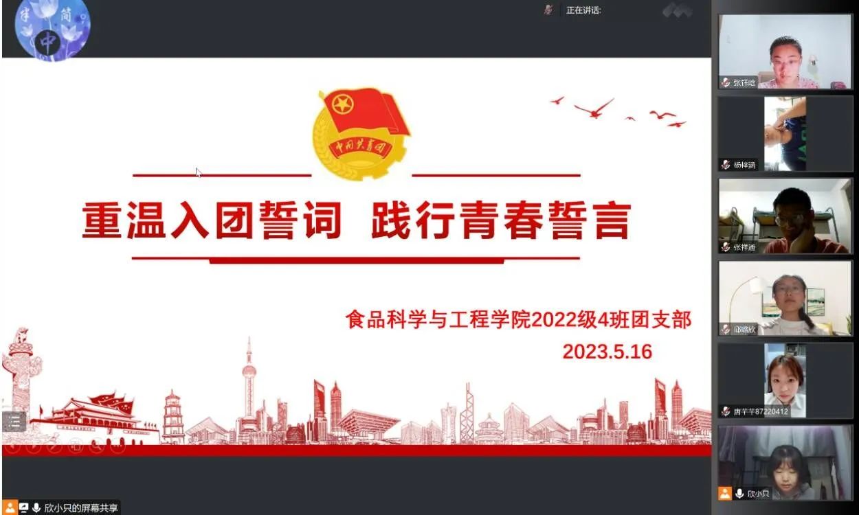 2022级1班团支部于5月15日举办了"青春心向党 重温入团誓词,践行青春诺言”团日活动,通过线上会议进行。