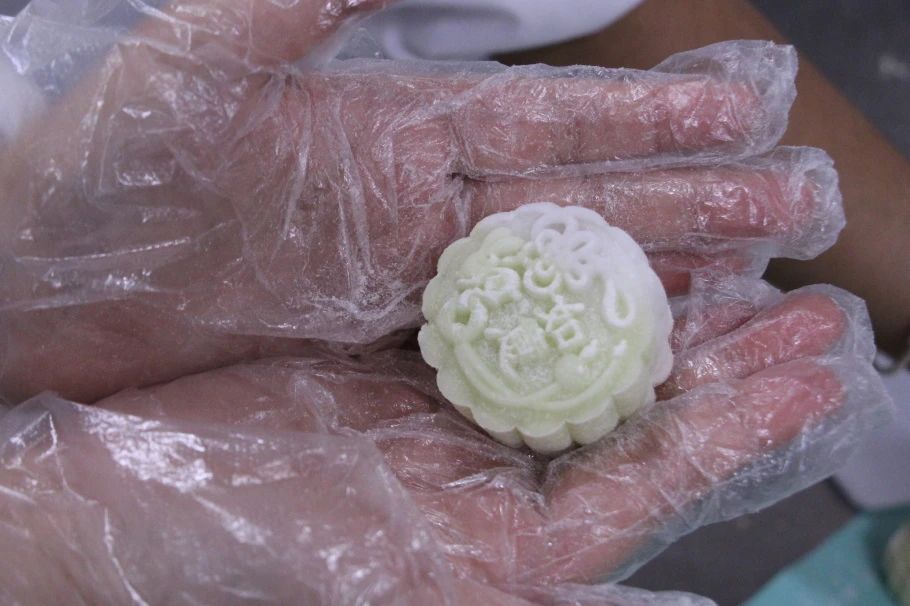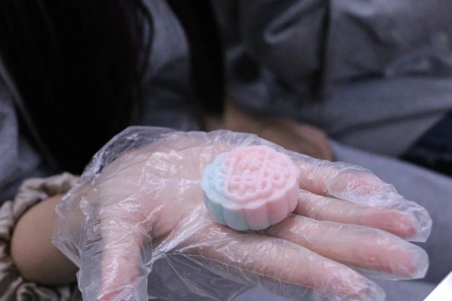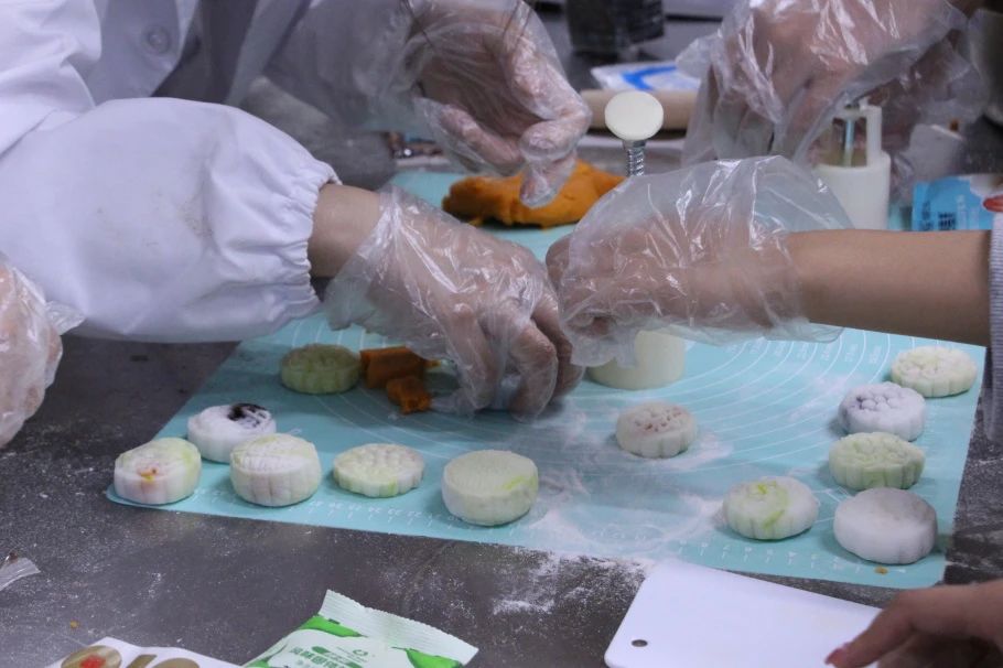 本次活动中,工作人员为同学们准备了可可、草莓、抹茶、原味的冰皮以及红豆沙、莲蓉、蛋黄三种口味的馅料。36名同学平均分为六组,经过工作人员耐心地示范月饼的制作过程,大家开始投身于紧张的制作环节。其中,富有相思之意的豆沙馅和奶香浓郁的蛋黄馅广受欢迎。