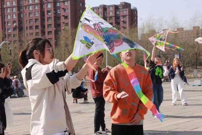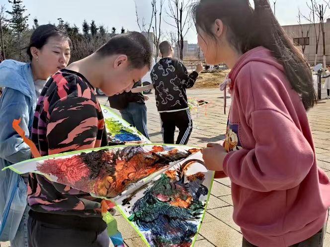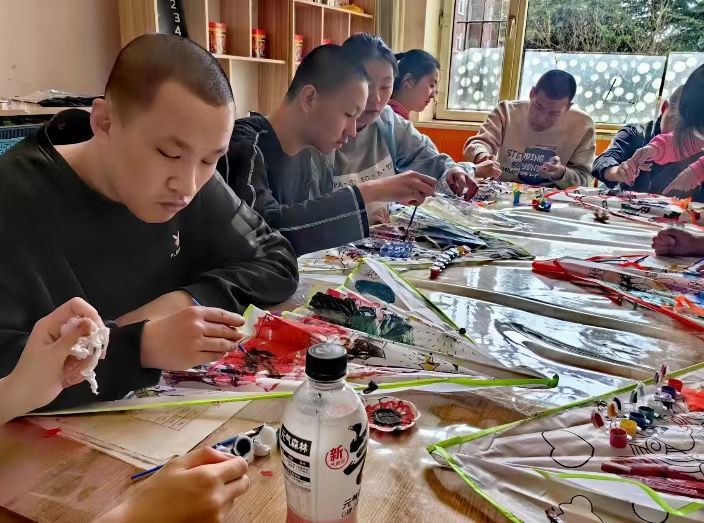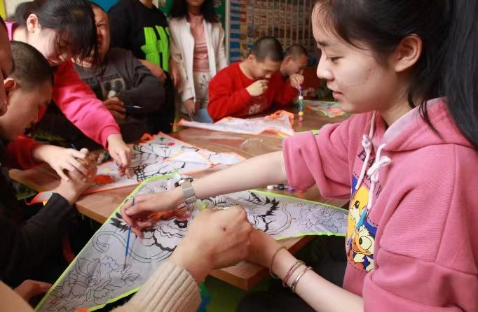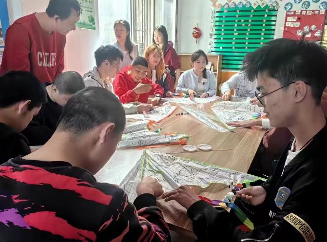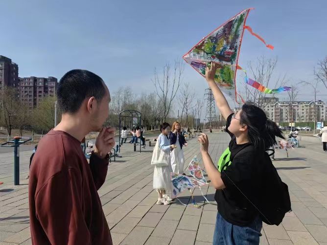 的学生志愿者于2024年4月14日来到长春市宽城区“与光同行”特殊儿童训练中心,和“与光同行”的自闭症儿童们一起绘制风筝、放飞风筝。
