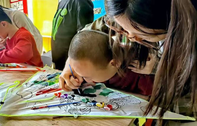 在绘画的过程中,志愿者们与“来自星星的孩子”们热情沟通,给予他们真挚的问候,让他们感受到温暖,并主动敞开心扉,融入到大家的世界之中。孩子们开心地用画笔在风筝上描绘着自己喜爱的图案,赋予它们鲜艳的色彩,在欢声笑语中创造着自己的作品。