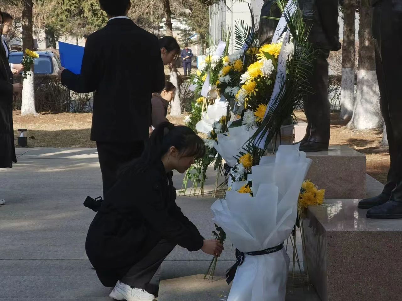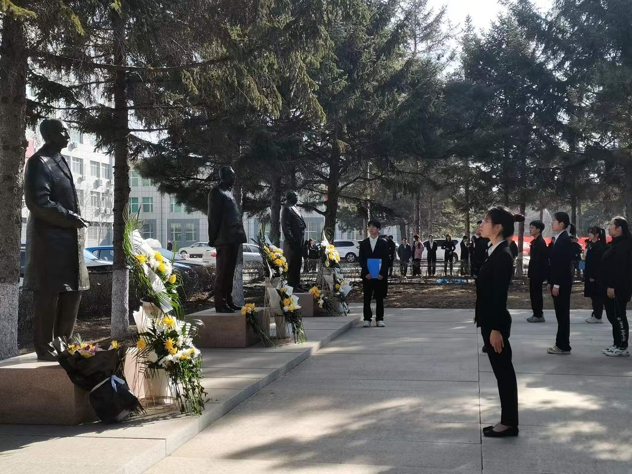 我院学子依次向三位科研巨匠献花,肃立瞻仰先辈雕像,静默一分钟。缅怀先辈,将先辈们的精神内化于心,外化于行。