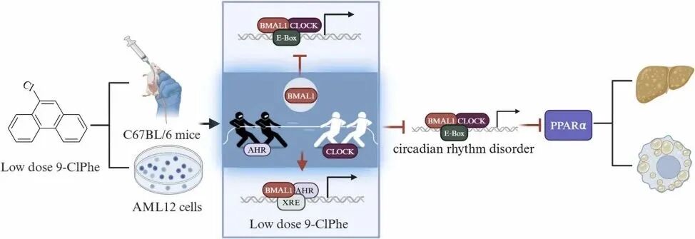 研究提出,9-ClPhe通过激活AHR,增强AHR与BMAL1的相互作用,减弱BMAL1与CLOCK的共定位,扰乱昼夜节律,进而影响PPARα依赖的脂质代谢,导致肝脏脂质积累。本文为评估ClPAHs的长期低剂量毒性提供了重要的实验依据,强调了环境因素在脂质代谢紊乱中的作用。同时,首次明确了9-ClPhe长期低剂量暴露的肝脏毒性及其通过昼夜节律干扰诱导脂质积累的机制,为评估ClPAHs的健康风险提供了新的实验依据和理论支持。