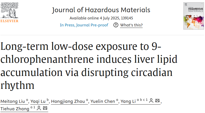 张铁华,李杨教授团队在环境科学与工程领域的国际顶级期刊《Journal of Hazardous Materials》(Q1,中科院1区,IF=12.2)在线发表题为“Long-term low-dose exposure to 9-chlorophenanthrene induces liver lipid accumulation via disrupting circadian rhythm”的研究文章。首次在 C57BL/6 小鼠中研究了慢性低剂量暴露于 9-ClPhe 对肝脏脂质积累和昼夜节律的影响,分析了涉及 AHR 受体的机制。bl动漫