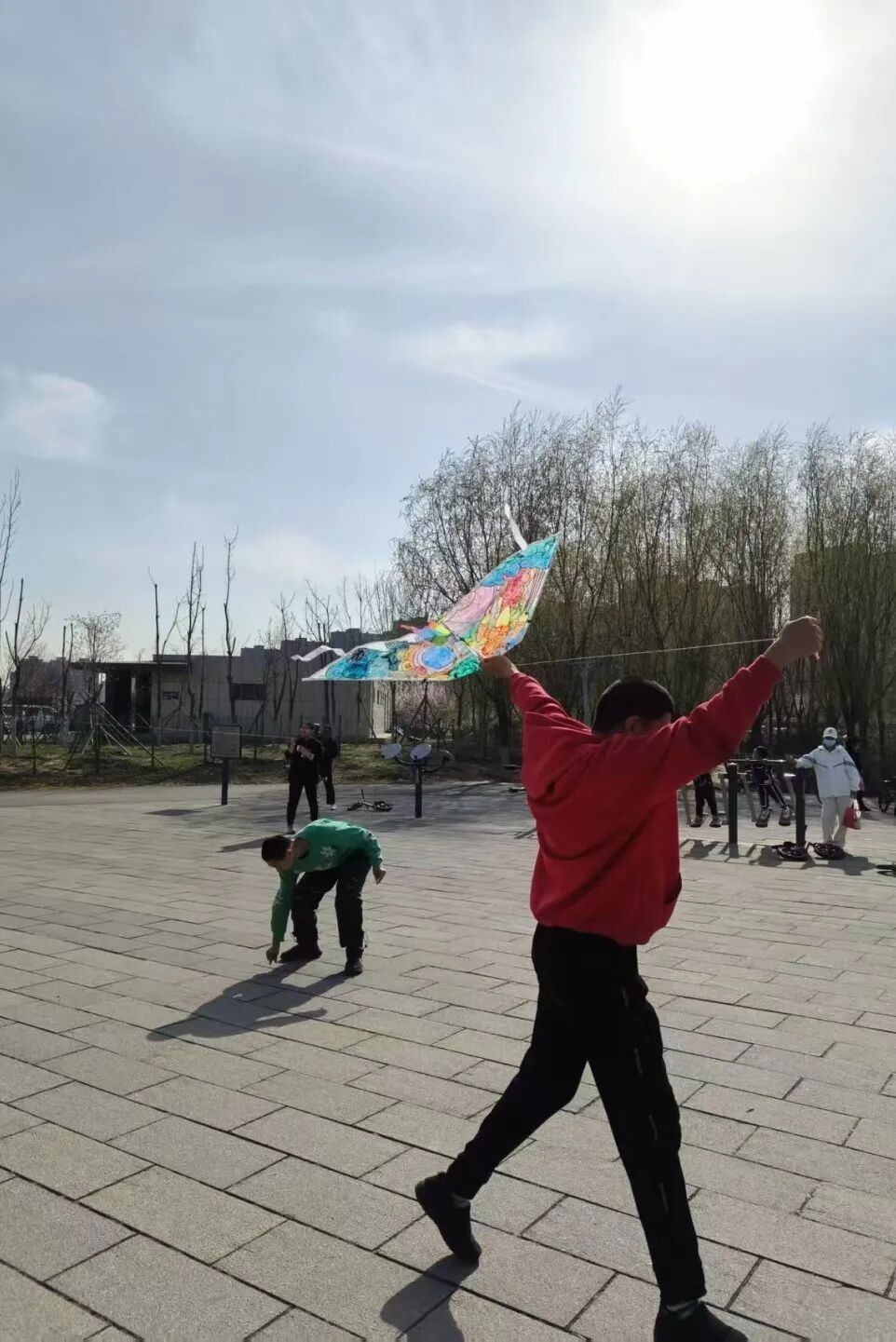 到了放飞环节,志愿者耐心引导孩子握住线轴,有的孩子第一次尝试,风筝刚起飞就坠落,在不断尝试中,风筝终于飞向蓝天,孩子们眼中绽放出惊喜的光芒,在开阔的广场上奔跑着、欢笑着,手中的风筝在空中高高飞翔。志愿者们在一旁为孩子们加油助威,与他们一起分享成功的喜悦。这一刻,孩子们的脸上洋溢着灿烂的笑容。