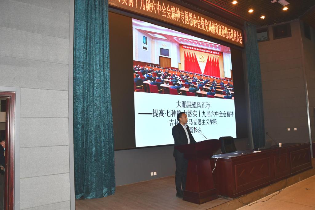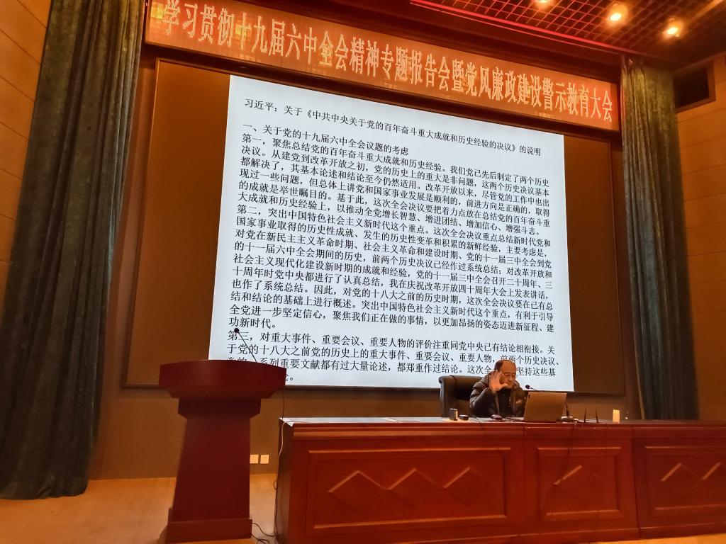 十九届六中全会精神宣讲团成员、马克思主义学院聂长久副教授。聂老师以“提高七种能力,落实十九届六中全会精神”为题,从十九届中央历次全会的背景及内容、十九届六中全会的公报、决议及要点进行了详细的解读,并就如何提高七种能力深入贯彻落实全会精神做了阐述。聂老师的报告,深入浅出,语言幽默形象,带领大家回顾了百年建党的历史沧桑,讲清了十九届六中全会精神的丰富内涵与核心要义,讲清了十九届六中全会是什么、为什么、决议了什么等根本问题。老师们专注倾听、收获满满,时时报以热烈的掌声。