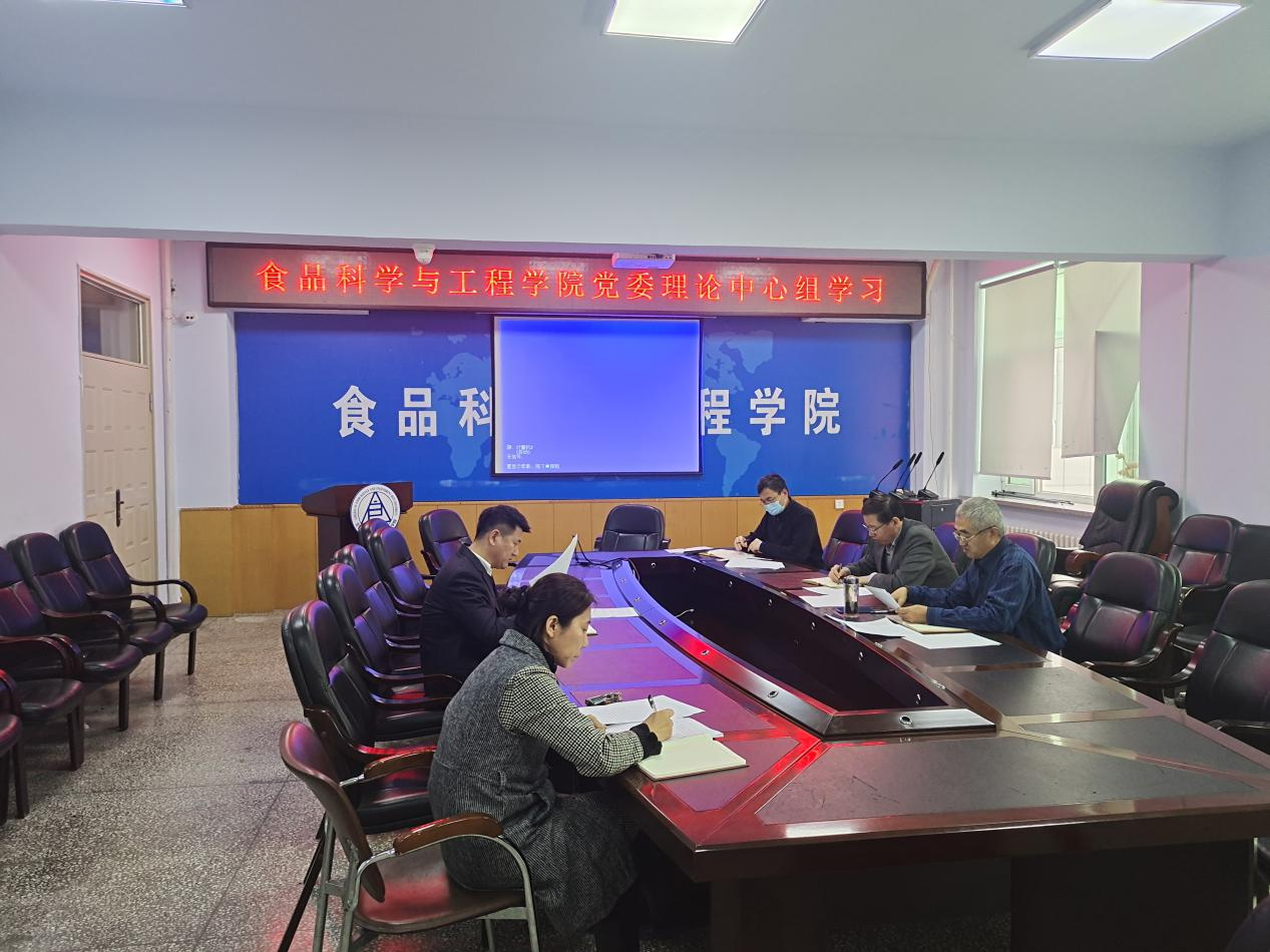在食品楼三楼会议室召开党委理论中心组学习会议。专题学习传达党的十九届六中全会精神和《中国共产党十九届六中全会公报》内容。学院党委理论中心组成员参加了会议,会议由党委书记董怀智主持。