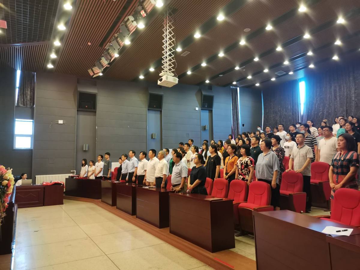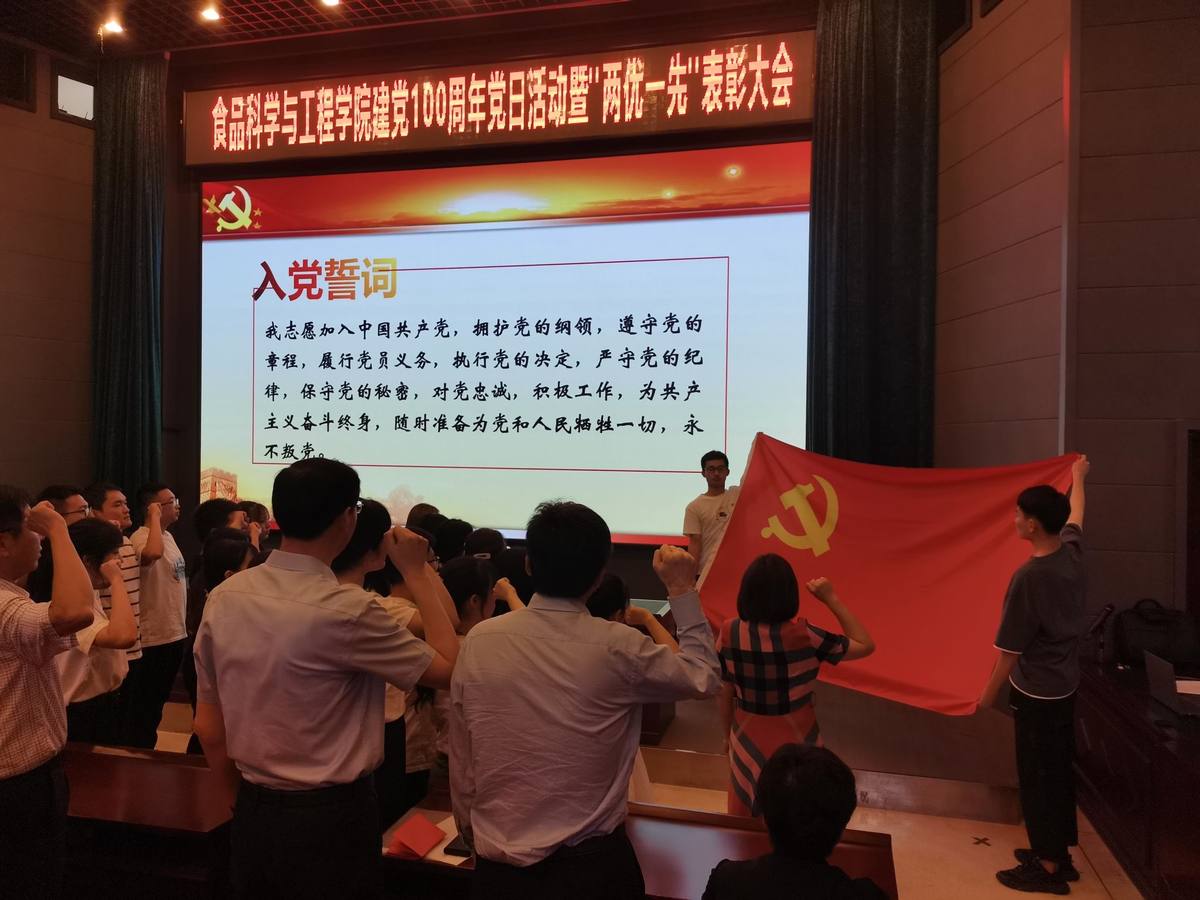 会议伊始,随着雄壮的《义勇军进行曲》响起,学院全体师生党员怀着崇高的敬意和无比的自豪高唱国歌,气氛庄严而肃穆。随后,在鲜红的党旗下,新老党员庄严地举起右手,在本科生第一党支部书记郝慧同志的带领下向党旗庄严宣誓,重温入党誓词。学院领导为新党员佩戴党员徽章,勉励全体党员发挥先锋模范作用,争做合格共产党员。