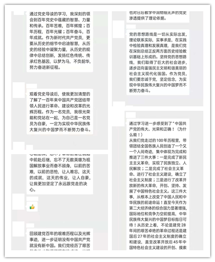 线上,支部党员们结合实际工作畅谈本次党史教育学习的心得体会。大家一致认为这是一次学党史、悟思想、受教育的宝贵经历,更加清楚的了解了百年来中国共产党团结带领人民进行革命、建设和改革的光辉历程,进一步感受到了中国共产党的伟大、光荣和正确。作为一名党员和人民教师,任重道远,应该时刻让自己的思想保持在和党一致的高度上,承担传授知识、培养能力、塑造正确人生观的职责,为国培养能担当民族复兴大任的时代新人,为中国人民谋幸福,为中华民族谋复兴。