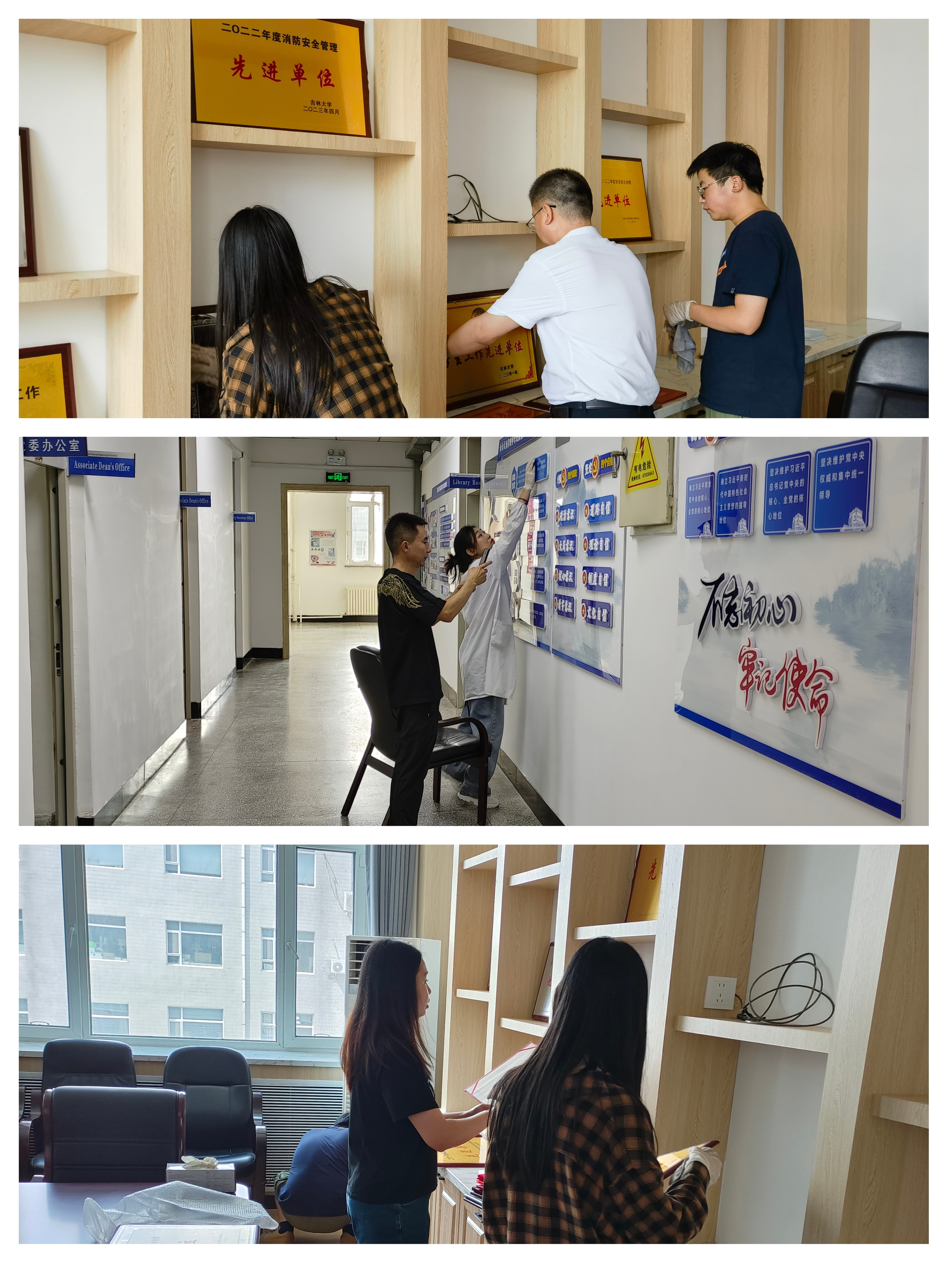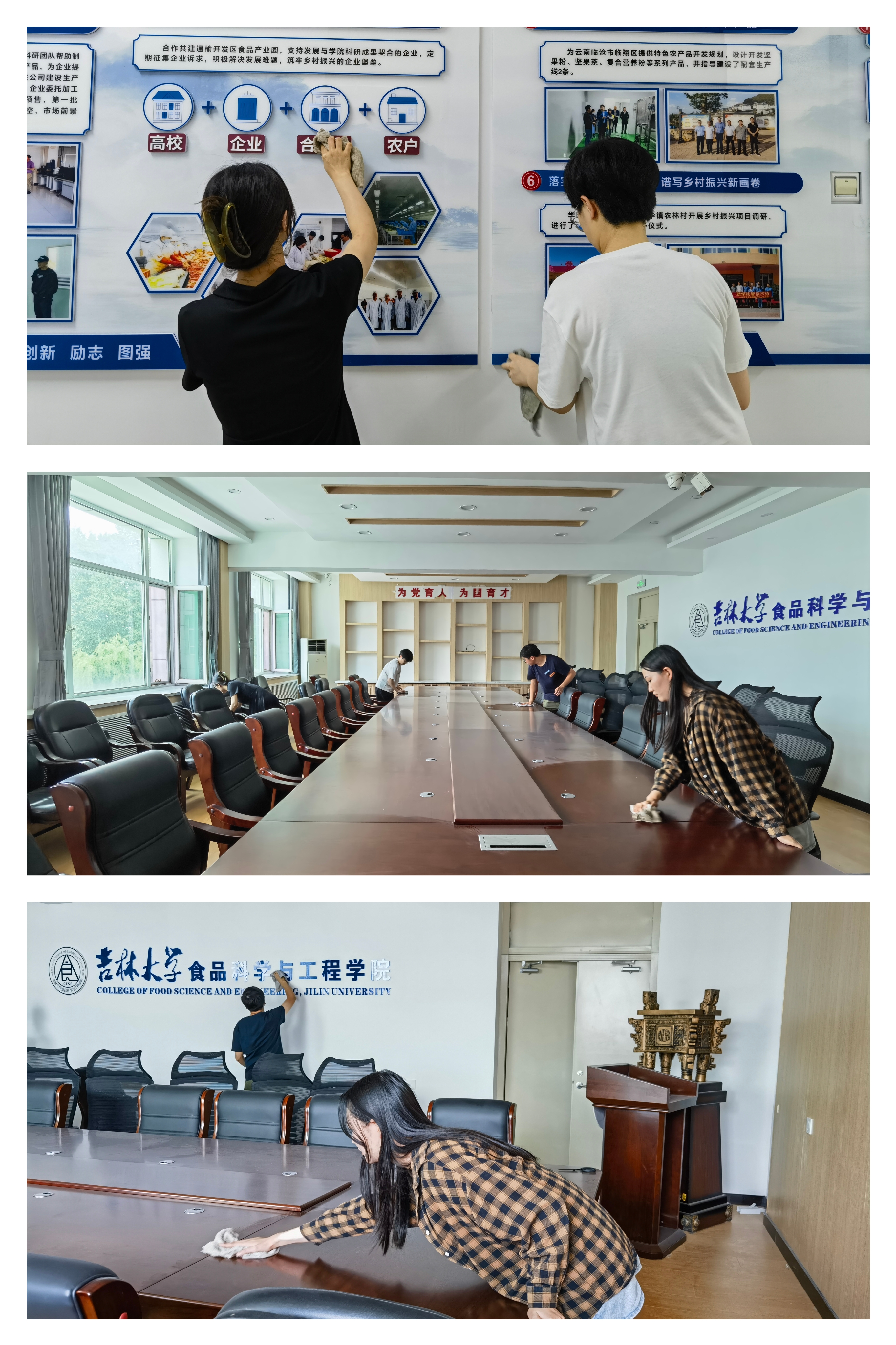 硕士学生第一党支部组织委员路琪同志带领第一、第二党支部入党积极分子韩清雯、胡亚楠、龚泠灵、王彦力和李俊峰五名同学对学院的会议室、活动室、文化长廊等场所开展卫生打扫,同学们有序进行扫地、拖地、擦拭桌椅、摆放物品、垃圾清理等工作,为全院师生提供了干净整洁的办公、学习环境。